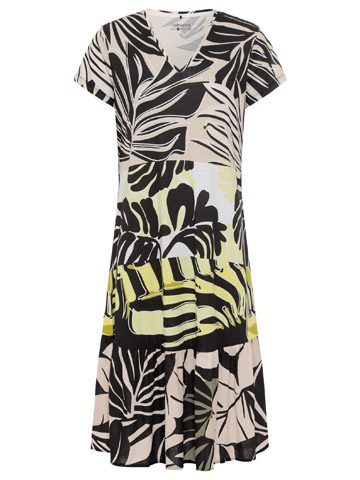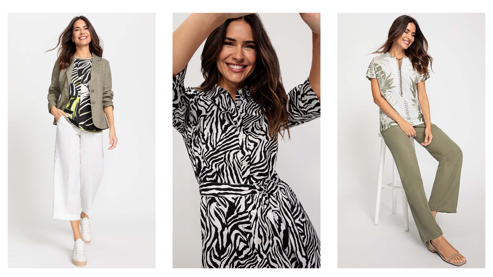 Welcome to the jungle! Modern looks in natural shades of green, trendy animal prints and exotic leaf prints will send you on a fashionable adventure. The ETHNO CHARM collection presents itself in a color scheme of black, white and khaki, with a vibrant lime green setting bright accents. Look forward to casual linen styles and new silhouettes.
