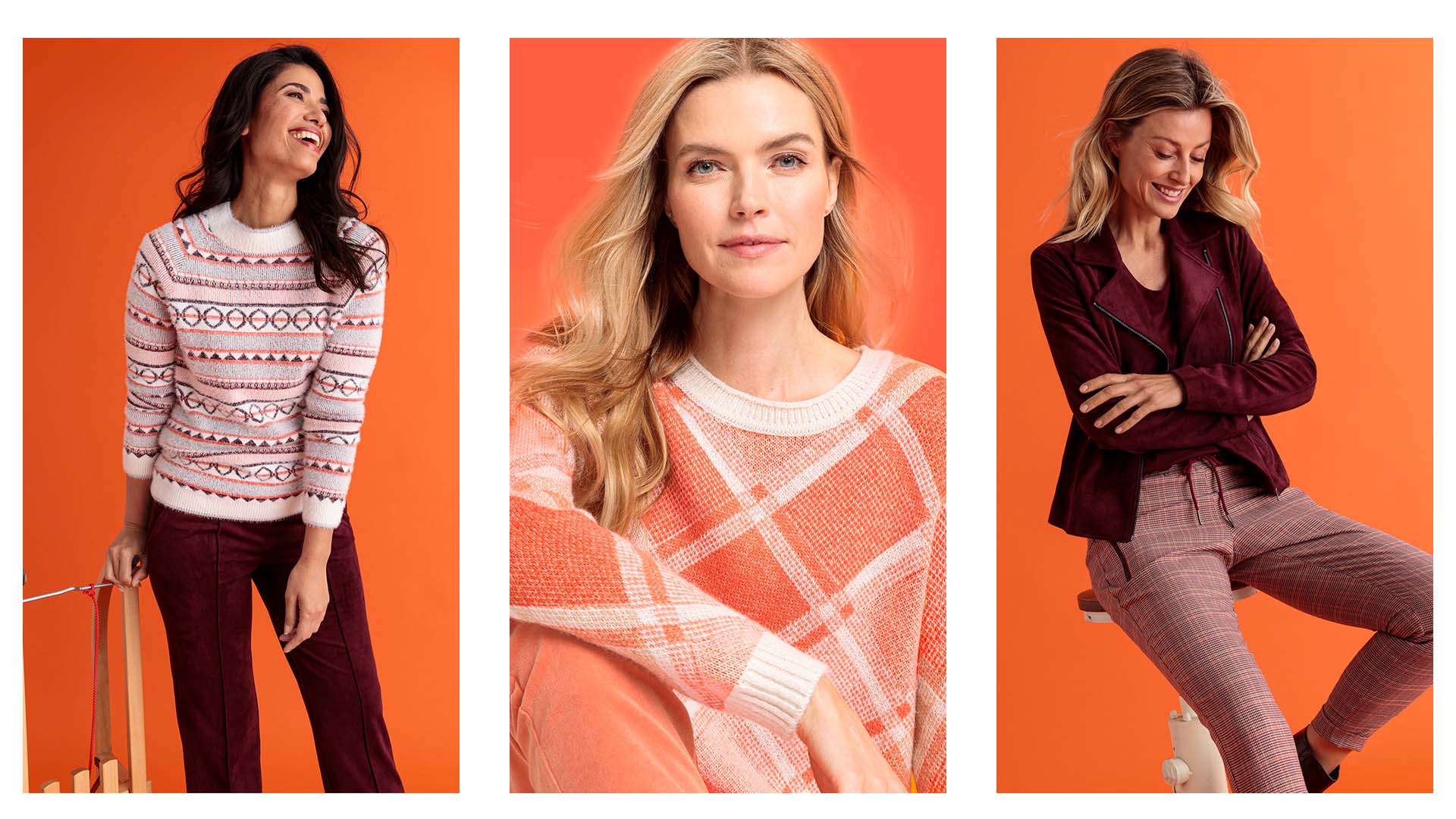 Winter mountain magic is the source of inspiration for the wonderful ALPINE LODGE collection, which fills this year’s fall/winter 2023 season with trendy styles. A bold orange provides the perfect splash of color and brings stunning looks when combined with cream and camel. Norwegian sweaters, soft materials and multi-faceted textures make a winter fashion statement.