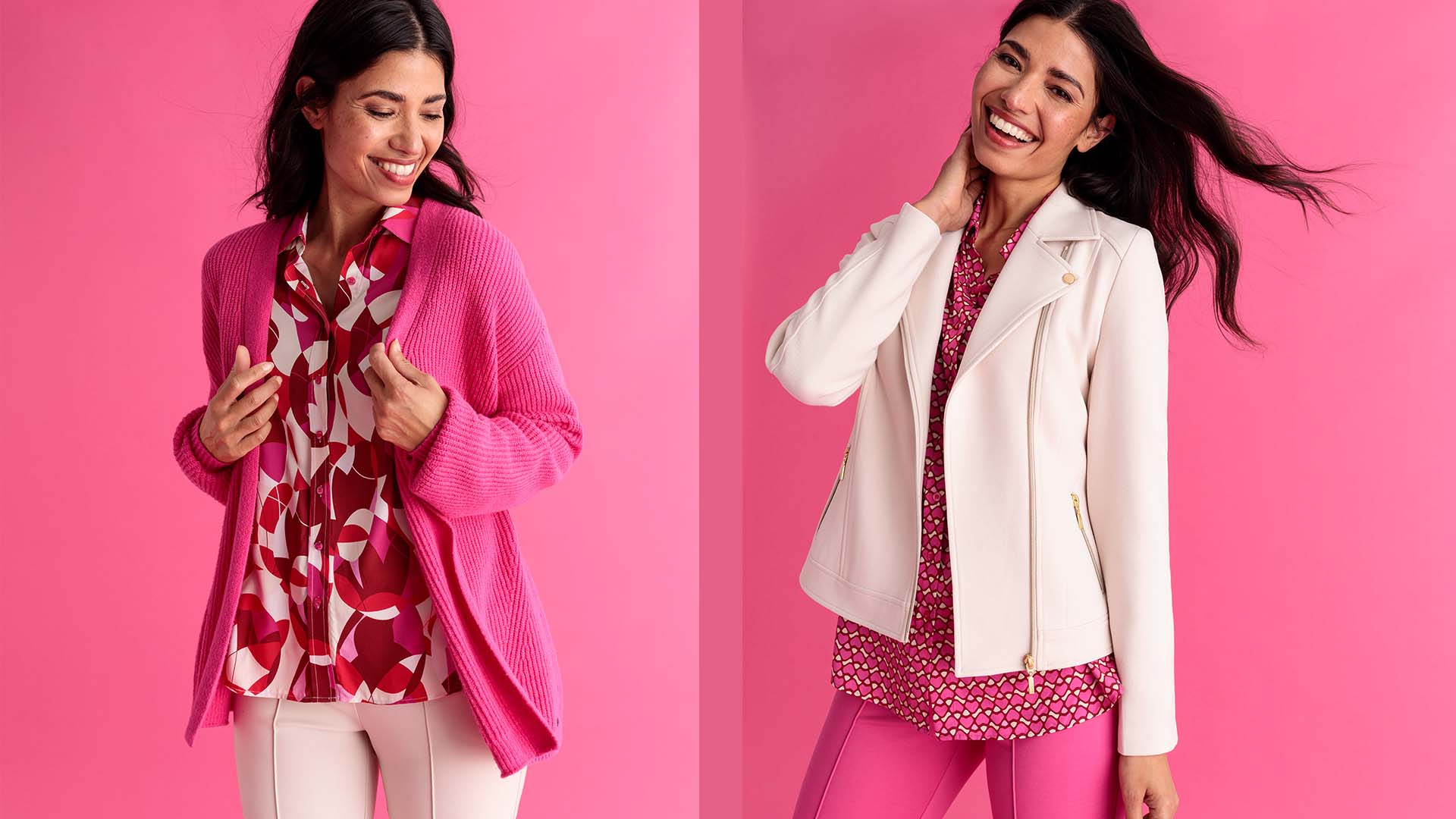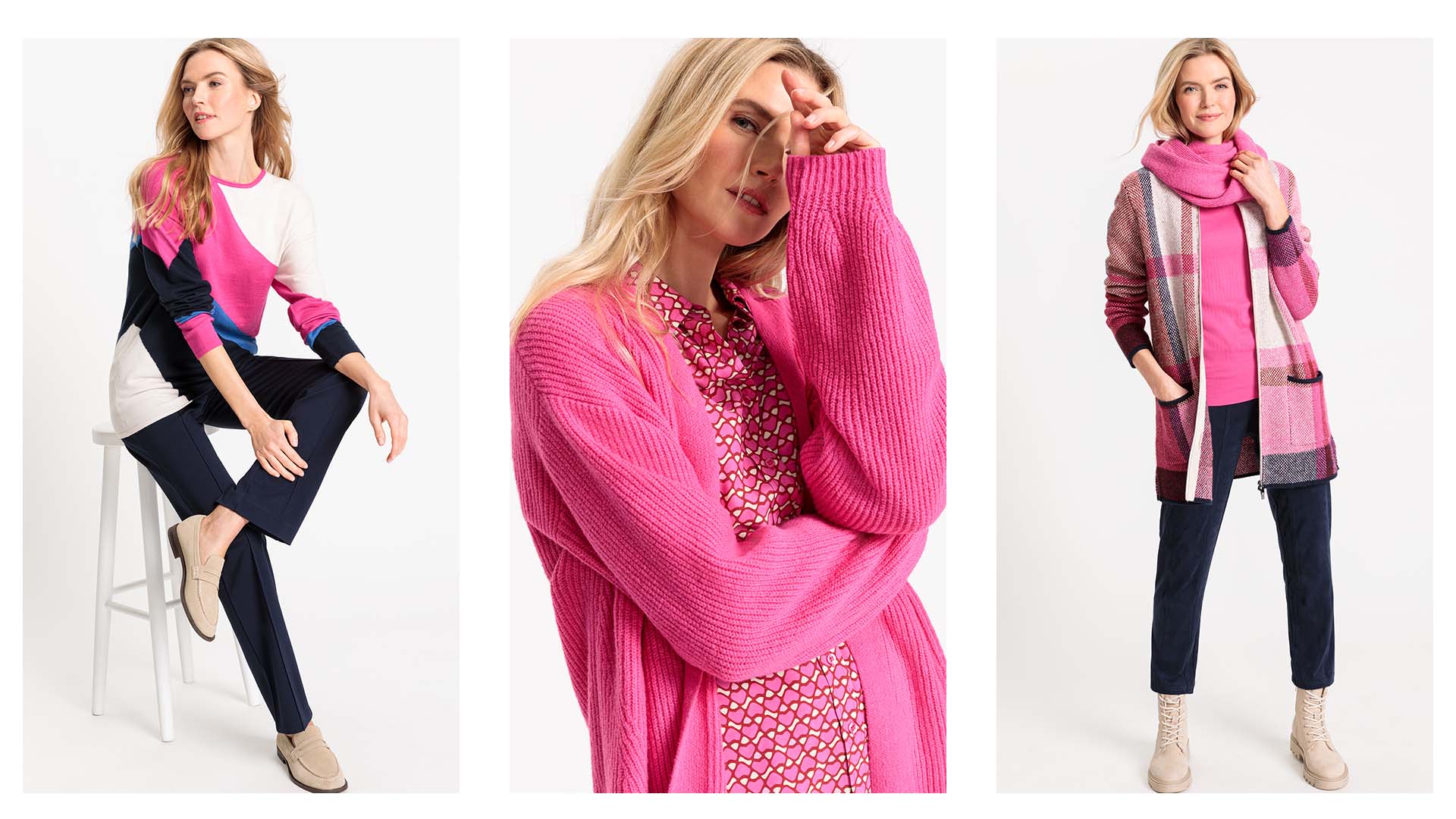 Time to get colorful! The new collection VIVID COLOUR lives the motto “bright colors” and takes us into an intense color frenzy with styles in wonderful shades of blue and pink. Stylish trends are incorporated with biker jackets, casual pants and vegan suede to spread a cool vibe. Fluffy knit basics made from recycled yarns also make a sustainable fashion statement.