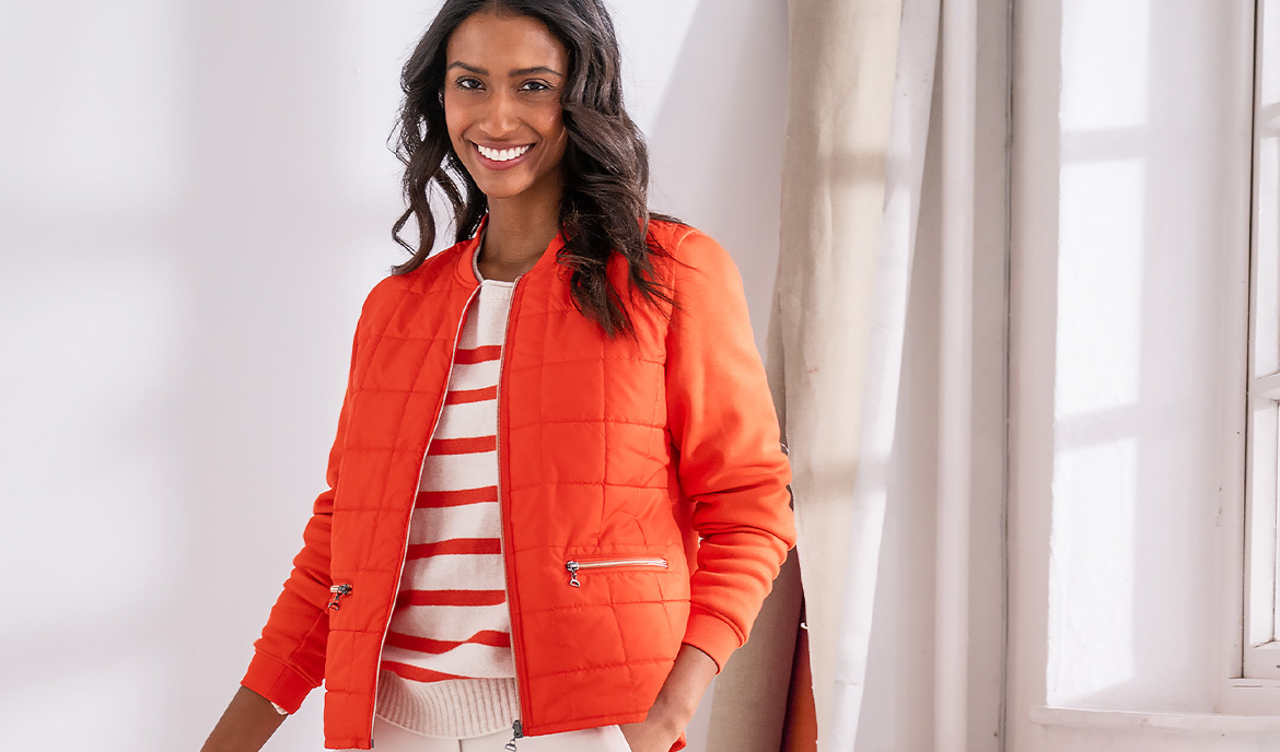Colour Harmony Tip: Since orange and blue sit opposite on the colour wheel, they are complementary colours so combining them results in an overall harmonious look. For end-of-summer evenings or early autumn mornings when a chill is in the air, this eco-friendly quilted car coat in coronet blue is the perfect topper to this look.