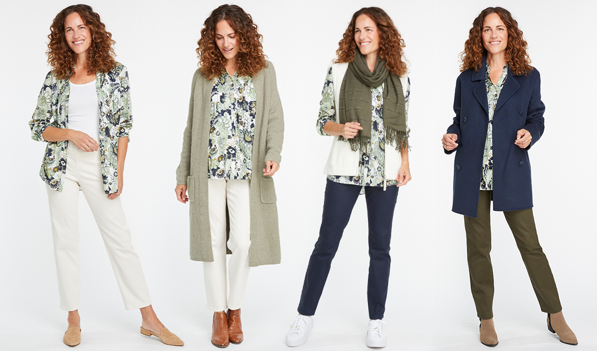Transformez cinq vêtements en trois looks faciles! Commencez avec une paire de jeans tendance bottillon dans une coupe parfaite et un chemisier imprimé sophistiqué.