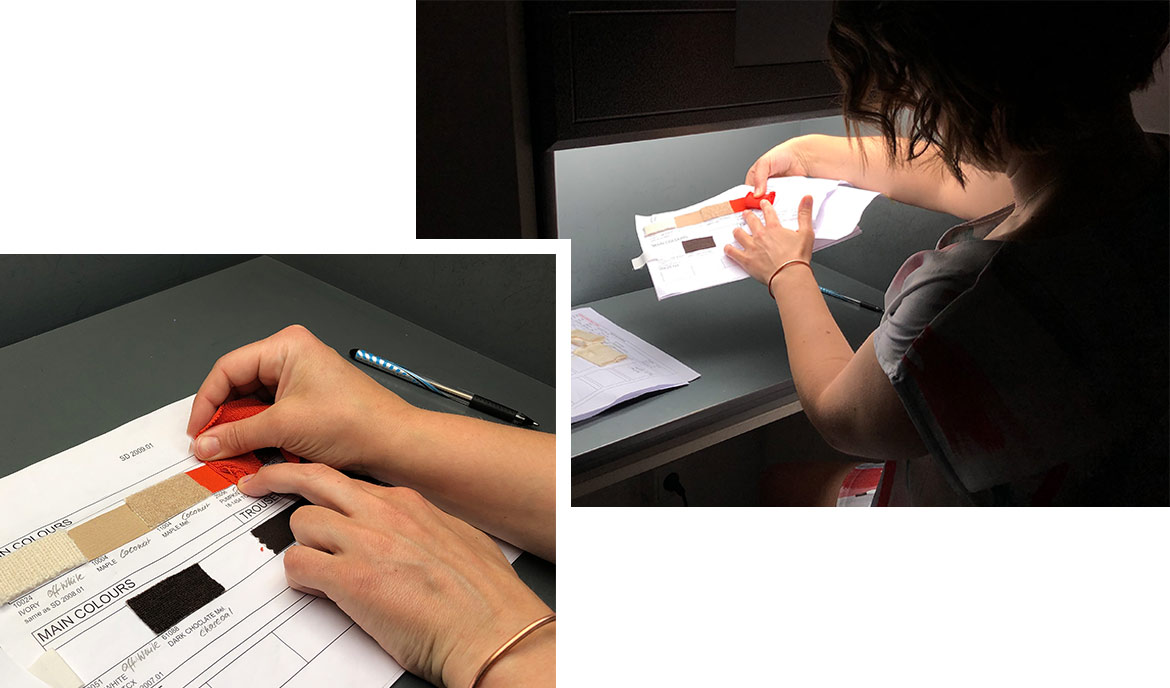 Je ne me suis jamais ennuyée au cours de ces six mois. Aucune journée n’était pareille. Mes tâches allaient de la recherche de tendances et de la création de tableaux d’ambiance à des tests approfondis de différentes qualités de tricot et couleurs de fil. Pour ces derniers, j’ai passé beaucoup de temps dans notre « boîte à lumière ». La lumière du jour y est simulée afin de mieux reconnaître et évaluer les différentes nuances de couleur. Pour chaque collection, certaines normes de couleur sont définies à l’avance et doivent correspondre précisément aux couleurs des fils.