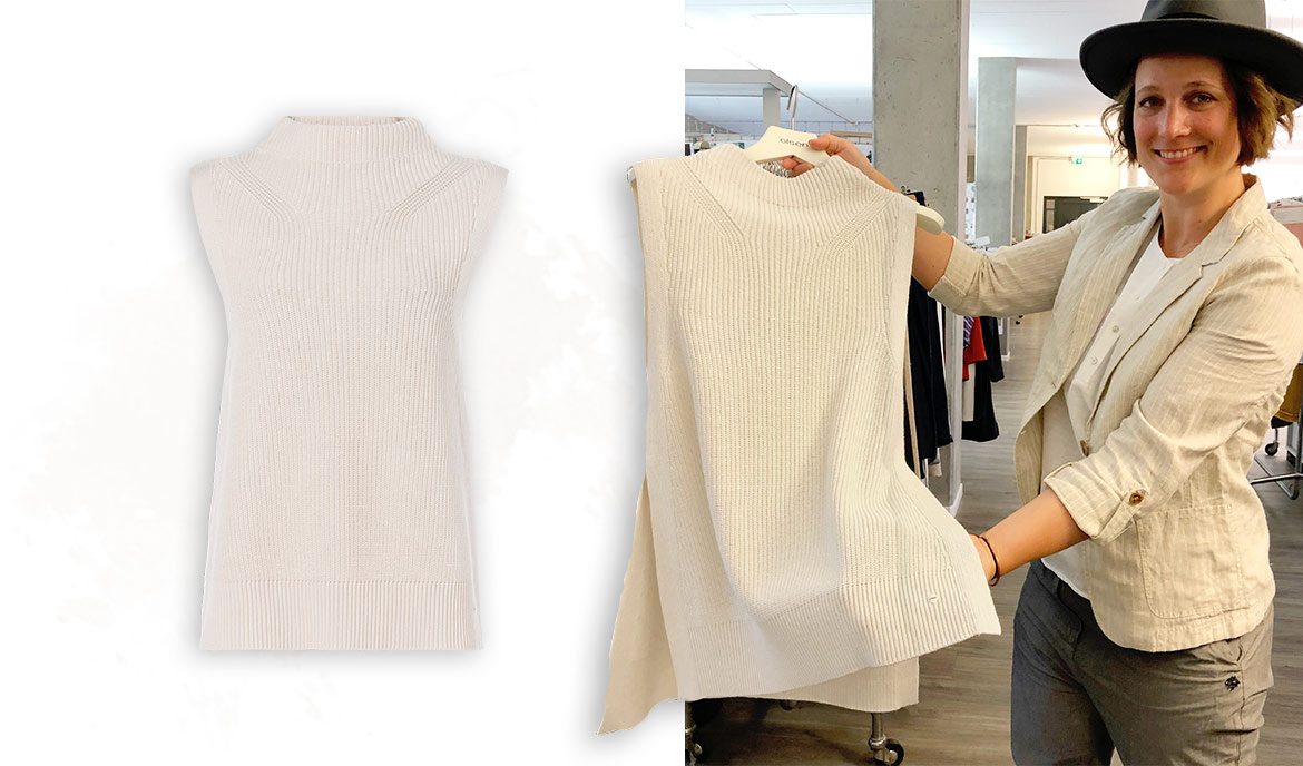 Bien sûr, on m’a aussi encouragée à aider Julia et Mona à concevoir certains styles de tricots et à leur faire part de mes propres idées. Je suis particulièrement fière du pull en tricot sans manches que j’ai conçu avec Julia. Je pense que le design est totalement innovant et j’ai déjà hâte de le porter à l’automne! Il sera disponible chez Olsen en septembre.